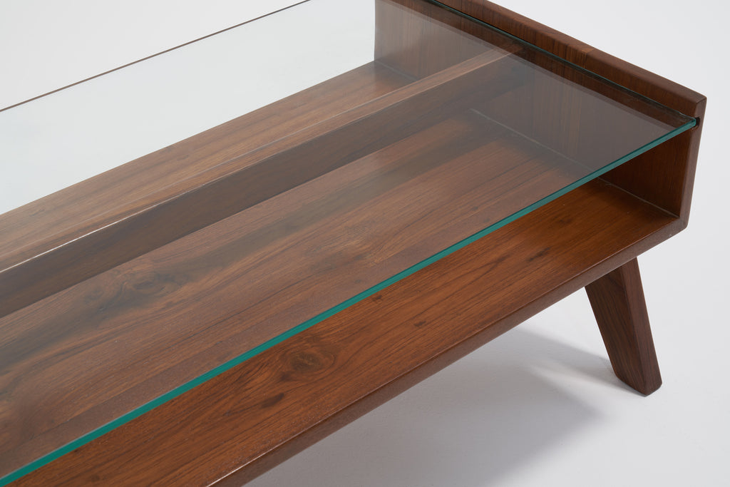 In Jeanneret's design, V-shaped legs, also known as compass legs, support the open cabinet, and the glass table top is supported by a teak bar that matches the body.