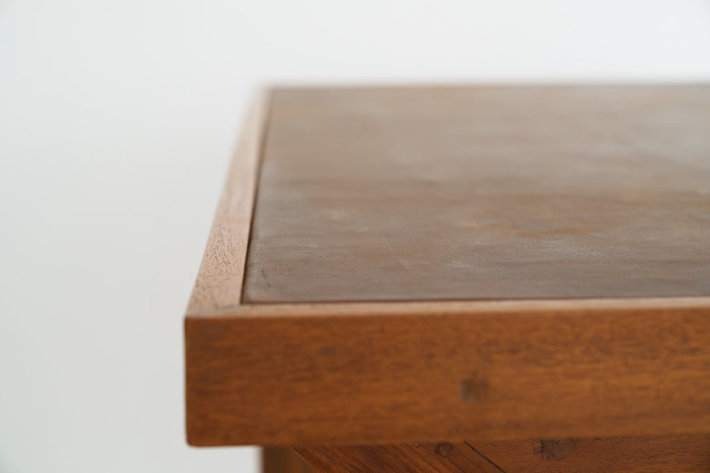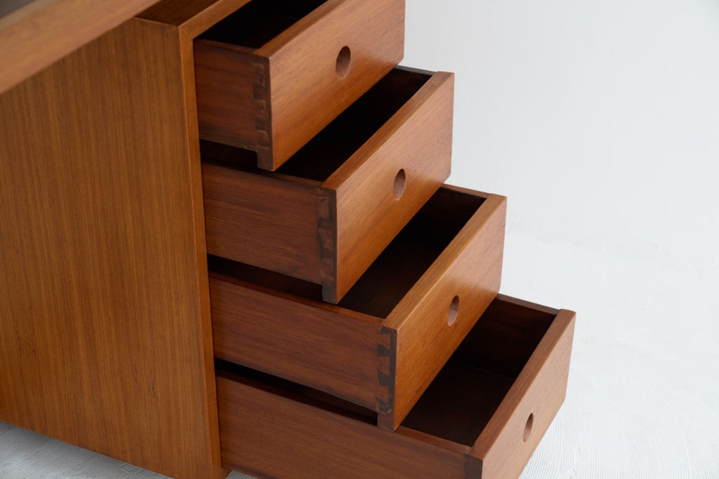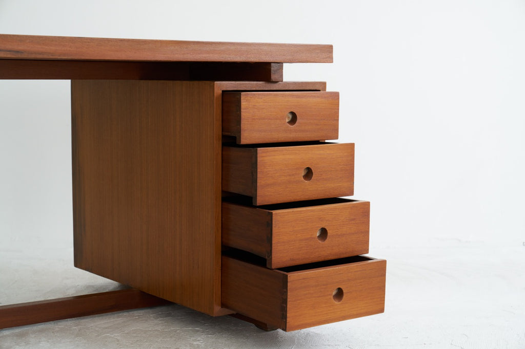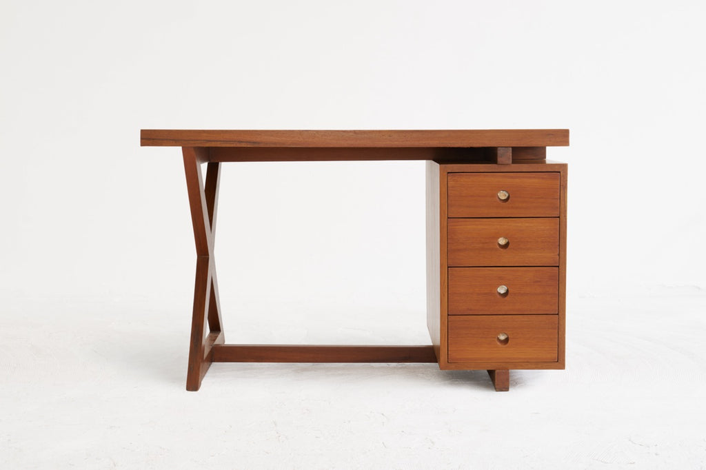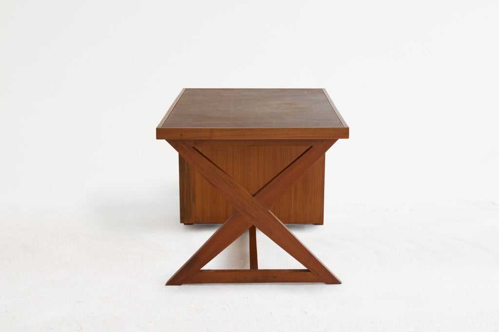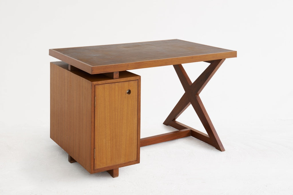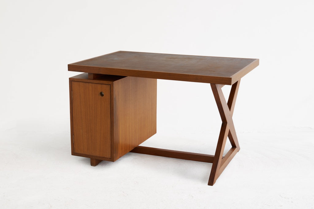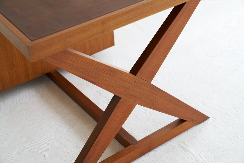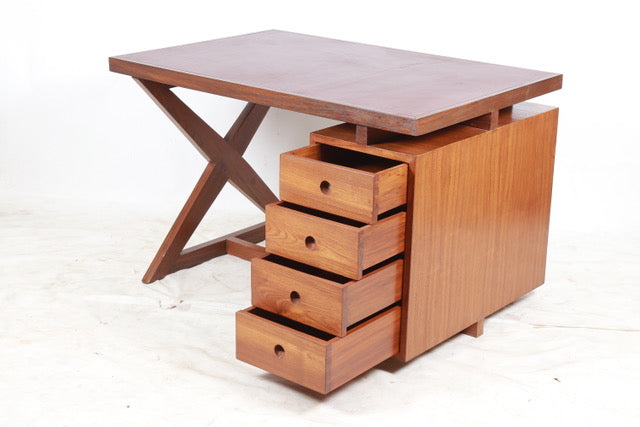 Typical Jeanneret design X-legs support one side, and a crossbar connects it to the opposite (right) side, which has four drawers. The pull of the drawer is a hollowed-out circle. The back of this drawer also has a box-like storage space. The desktop is made of leather.